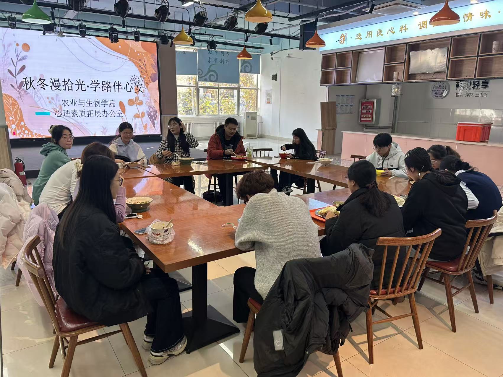 活动伊始,同学们围坐餐桌,以美食为媒介,开始了本次活动的交谈,心理素质拓展办公室干事及研究生代表围绕“学风建设中的心理保障”核心议题,详细汇报了同学们近期心理健康状况,重点聚焦考试复习周学业压力、考试焦虑等引发的情绪波动问题,为后续针对性施策提供了精准依据。